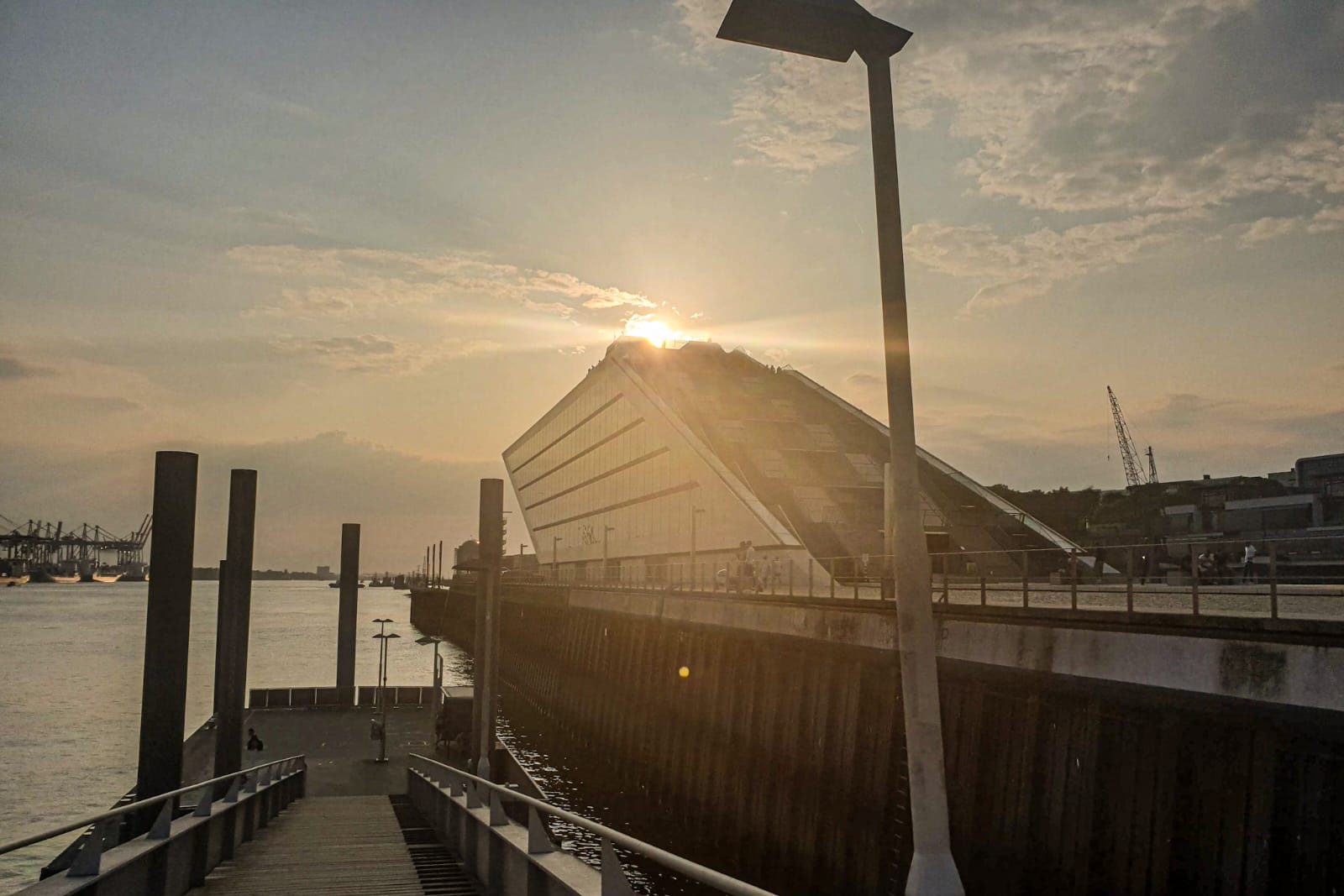Zur blauen Stunde zeigt das Dockland seine ganze Magie. Die Glasfassade spiegelt Himmel und Wasser in zarten Blau- und Silbertönen. Die Linien des Gebäudes strukturieren die umliegende Hafenlandschaft klar. Sonnenuntergang und Abenddämmerung lassen das Dockland leuchten und erzeugen ein Spiel aus Licht und Schatten. Fotografen aller Erfahrungsstufen finden hier perfekte Motive. Architektur, Licht und Wasser verbinden sich zu einem einzigartigen Zusammenspiel von Technik, Natur und Stadt.